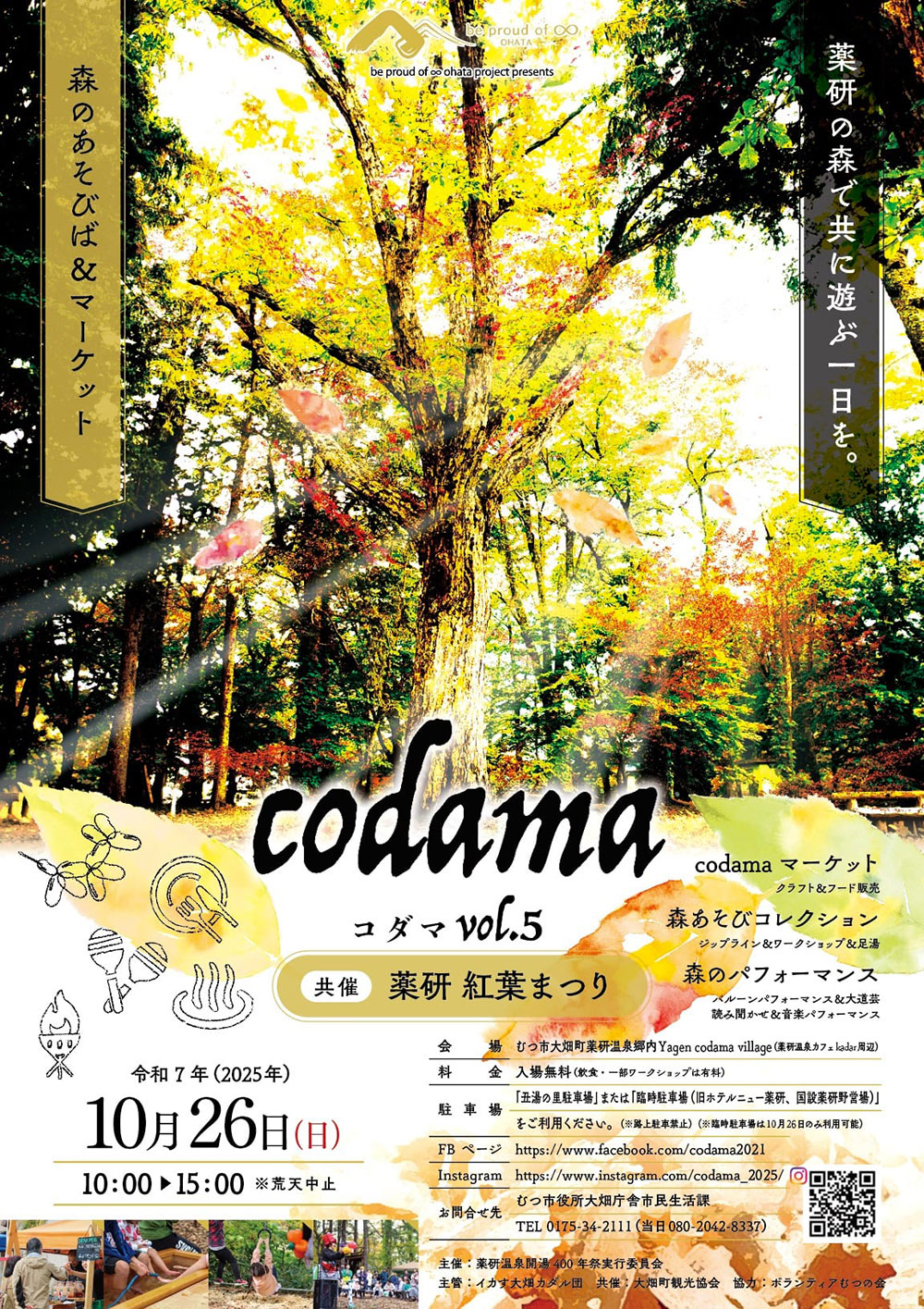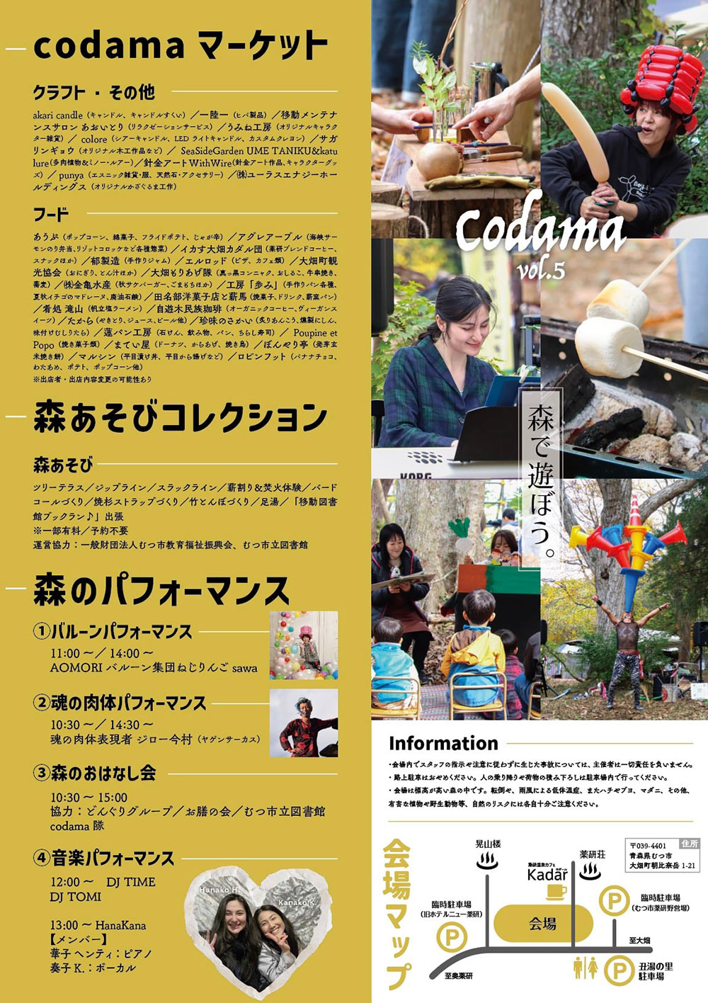 ・会場は標高が高い森の中です。転倒や、雨風による低体温症、またハチやブヨ、マダニ、その他、有害な植物や野生動物等、自然のリスクには各自十分ご注意ください。